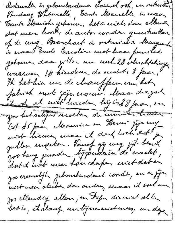 Vanaf gij weg zijt ben ik toch zo bang geworden, bijzonder in de nacht, dat ik niet meer kan slapen, niet dat er zo vreselijk gebombardeerd wordt, en er zijn niet meer alerten dan anders, maar ik voel me zo ellendig alleen, en Papa die niet al te best is, ik slaap bijna niet meer , een dezer nachten zal , ik hoop het, goed slapen.. Ik heb dus de chauffeur hier en nonkel Charles ook.