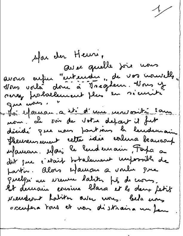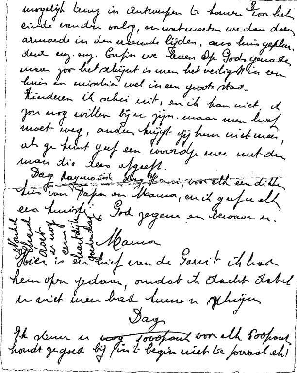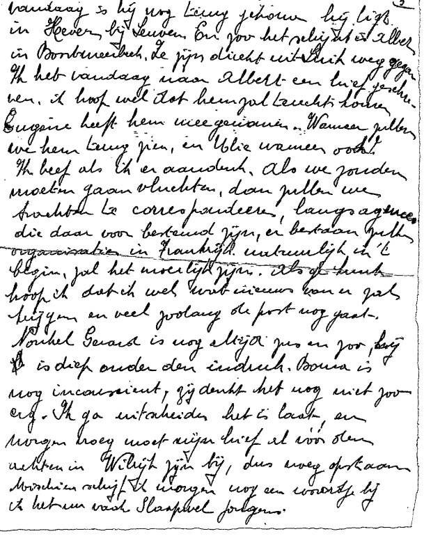 Als we zouden moeten gaan vluchten, dan zullen we trachten te corresponderen, langs agencies die daarvoor bestemd zijn.Organisaties in Frankrijk. Natuurlijk zal het in het begin moeilijk zijn. Als ge kunt hoop ik wel wat nieuws van u te krijgen, wel zolang de post nog gaat.