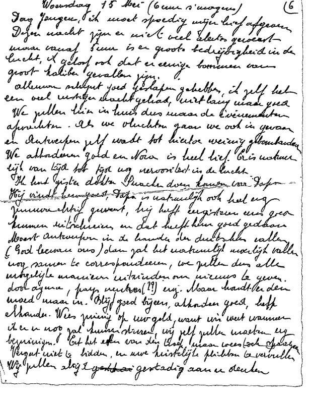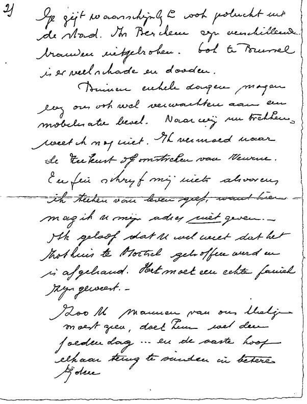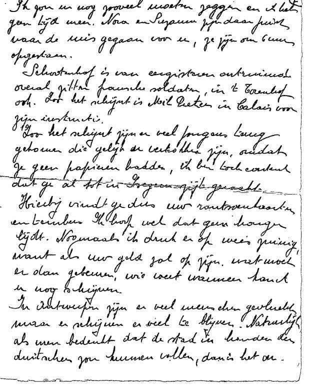 Door onze uiterst slechte ligging, na tot 8 uur in de kelder te hebben gezeten, zijn we buiten de stad moeten vluchten. Tegen den middag zijn we teruggekeerd naar het Pulhof en hebben al het noodige meegenomen en naar de omstreken van Waterloo gevlucht bij familie. Het was vreselijk bij ons. Veertig vliegtuigen tegelijk .... dat deed ons onmiddellijk besluiten dat "het gebakken was"! Ik hoop dat het met u ook goed gaat en mocht mijn brief bij u belanden!