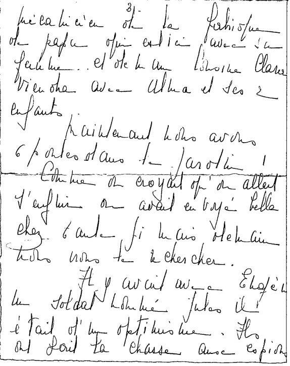 Il y a un mecanicien de la fabrique de papier qui est ici avec sa femme... et demain Blanche Claire viendra avec Alma et ses 2 enfants. Maintenant nous avons 6 poules dans le jardin ! Comme on croyait qu'on allait s'enfuir on avait envoyé Bella chez tante Fi mais demain nous irons la chercher. Il y avait avec Eugène un soldat nommé Jules il était d'un optimisme. Ils ont fait la chasse aux espions.