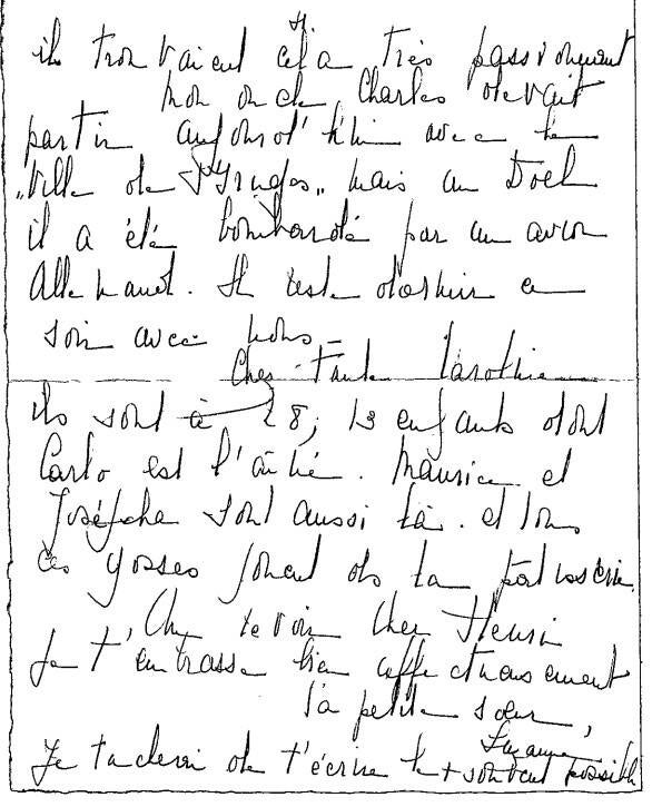 Tant merci (?) de nous téléphoner pour nous donner de vos nouvelles ! Tu ne peux t'imaginer comme cela nous a fait plaisir. J'espère que vous êtes bien placés et qu'à Izeghem vous ne voyez pas trop d'avions et surtout que vous ne les entendez pas trop.