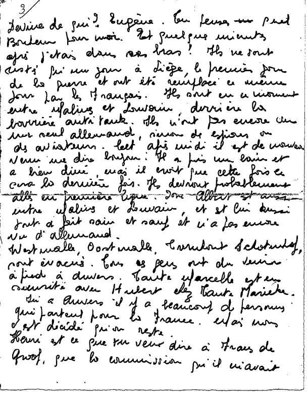 Devine de qui? Eugène. Tu penses quel bonheur pour moi. Et quelques minutes après j'étais dans ses bras! Ils ne sont restés qu'un jour à Liège, le premier jour de la guerre et ont été remplacés ce même jour par les Français. Ils sont en ce moment entre Malines et Louvain, derrière la barrière anti-tank. Ils n'ont pas encore vu un seul allemand, sinon des espions ou des aviateurs. Cet après midi il est de nouveau venu me dire bonjour. Il a pris un bain et a bien dîné, mais il croit que cette fois ce sera la dernière fois. Ils devront probablement aller en première ligne. Ton Albert est aussi entre Malines et Louvain, et est lui aussi tout à fait sain et sauf et n'a pas encore vu d'allemand. Westmalle, Oostmalle, Brecht et Schotenhof, sont évacués. Tous ces gens ont dû venir à pied à Anvers. Tante Marcelle est en sécurité avec Hubert chez Tante Marieke. Ici à Anvers il y a beaucoup de personnes qui partent pour la France. Mais nous, c'est décidé qu'on reste. Henri est ce que tu veux dire à Frans de Groof, que la commission qu'il m'avait confiée a été faite. Fernande est venue le lendemain jusqu’ici et tout est en règle. Cher Henri, écris-nous vite de vos nouvelles. Ghou Lauwen est parti le même jour que vous, seul en vélo, c’est dommage qu’il n’a averti car il aurait pu venir avec vous. Fais un bonjour de ma part à René et Frans. Et mes plus affectueux baisers pour Raymond et toi. Lucienne