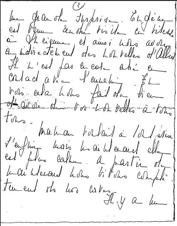 Hier soir nous avons eu une grande surprise. Eugène est venu nous visiter en vitesse à Lucienne , et ainsi nous avons eu indirectement des nouvelles d’Albert. Il n’est pas encore entré en contact avec l’ennemi. Enfin voilà cela nous fait du bien d’avoir de vos nouvelles à vous tous.