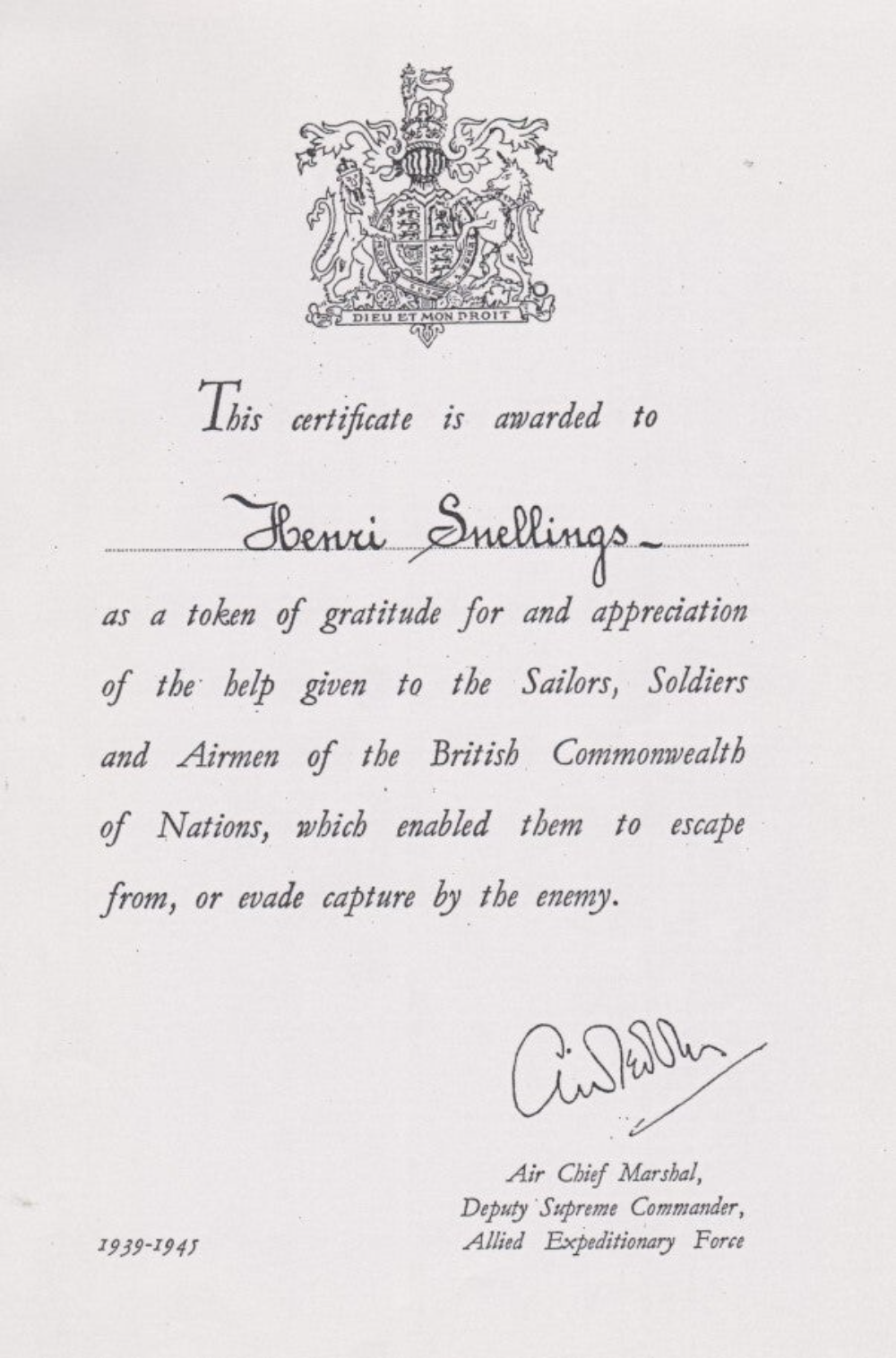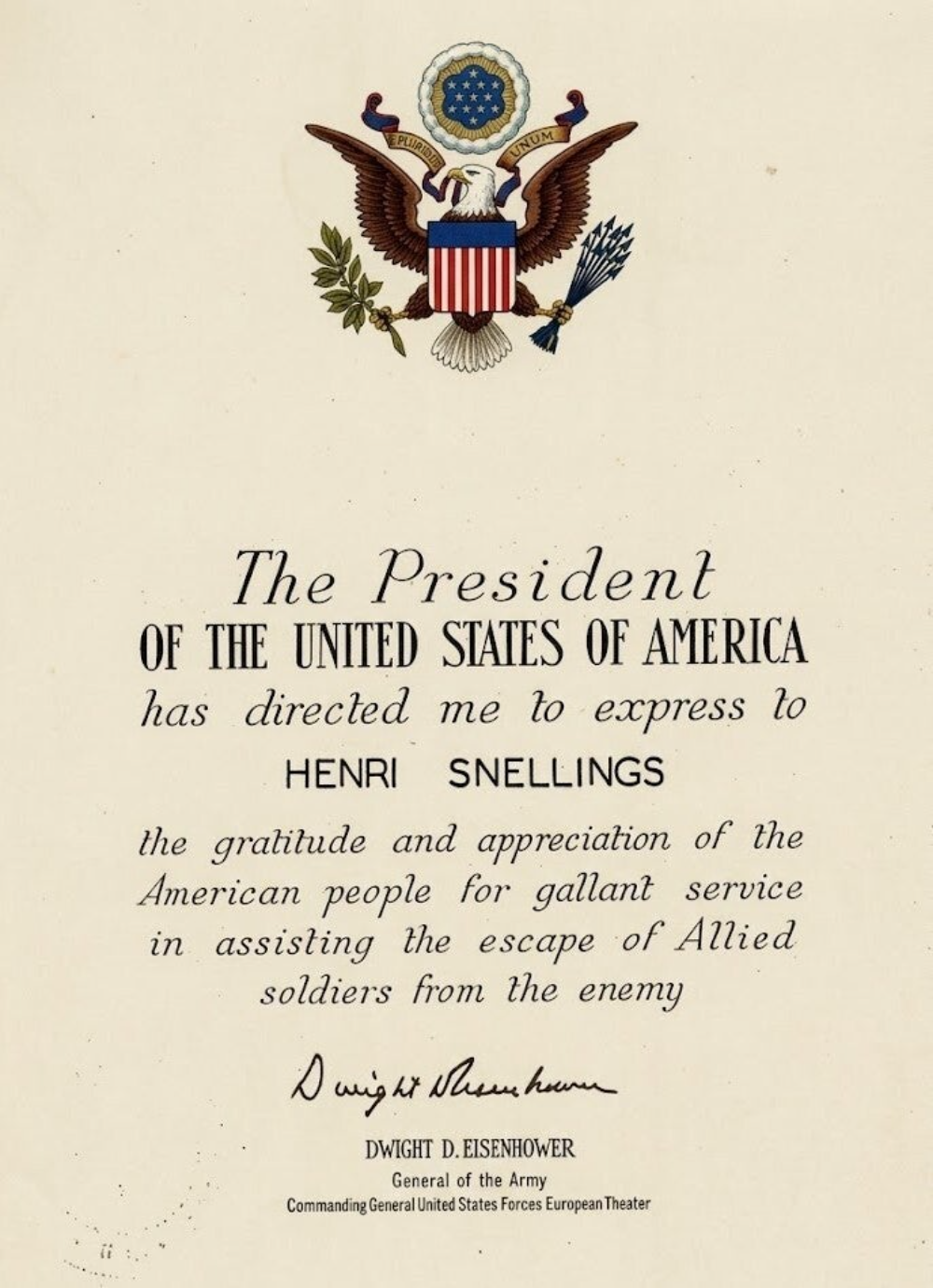 De auteur, Roger Anthoine beschrijft in zijn boek “Forteresses sur l’Europe” het hele verhaal. Zijn boek is in verscheidene afleveringen verschenen in de krant “Le Soir”. De aflevering van 21 augustus 1973 vertelt het hele gebeuren. In deze aflevering wordt Henri Snellings uitvoerig geprezen voor zijn moedig optreden. Na de oorlog werd hem een door Generaal Eisenhower ondertekende oorkonde overgemaakt als dank en erkenning. Ook vanwege de Britse legerleiding werd hem zulke oorkonde overgemaakt.