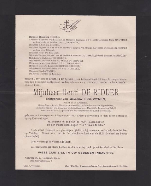 Op 24 februari 1946 sterft Henri De Ridder op 62-jarige leeftijd.