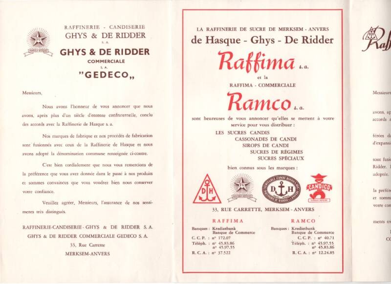 Mei 1957 fusioneren “Ghys & De Ridder” en de suikerraffinaderij van “de Hasque” zich onder de naam van “Raffima “ met “Ramco” als Raffima- commerciale. De productie van de Hasque wordt ook in Merksem ondergebracht.