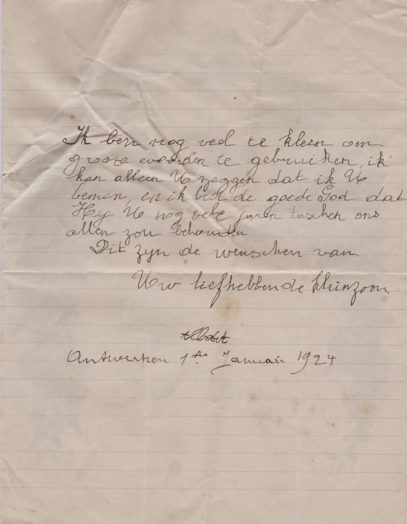 Nieuwjaarsbrief van kleinzoon Albert (6 jaar) aan zijn bomma : 1 Januari 1924