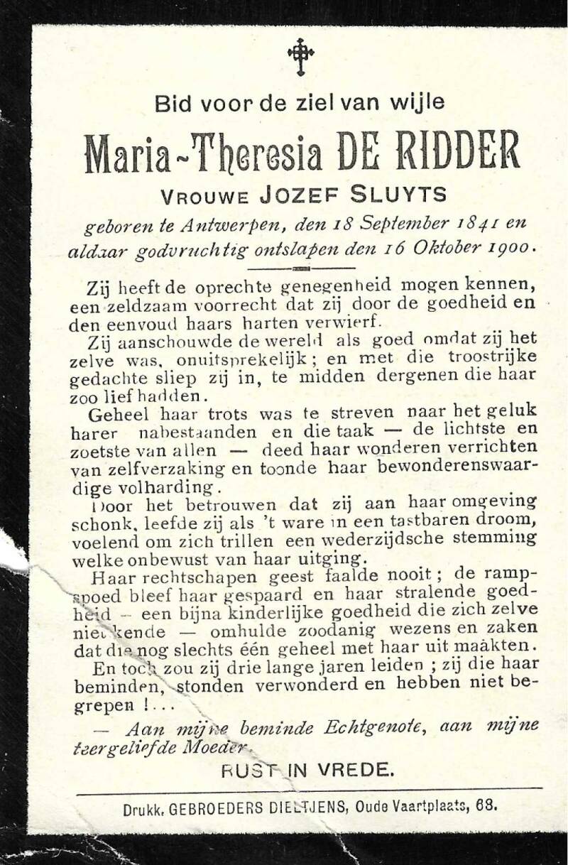 Op 16 october 1900 sterft zijn zus Maria-Theresia De Ridder.