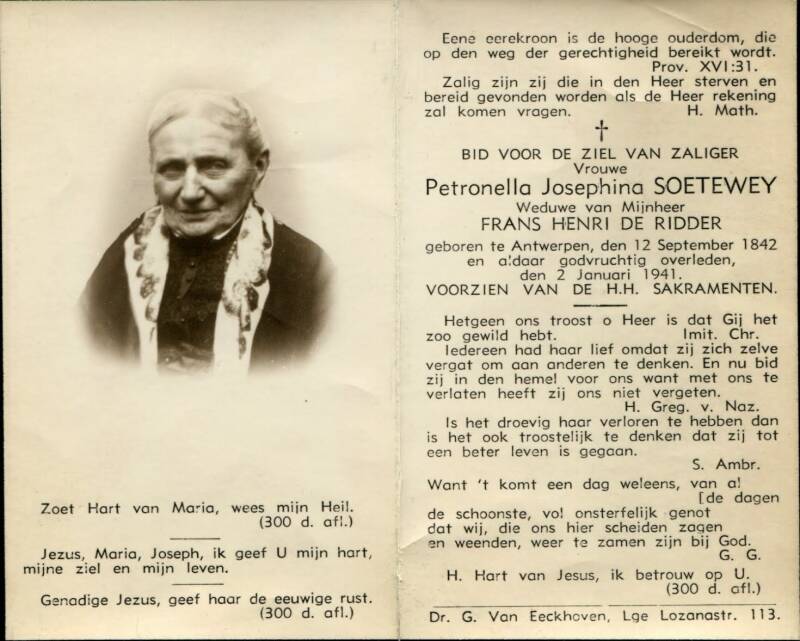 Josephina is bijna 100 jaar oud geworden en heeft 3 oorlogen gekend : 1870/1914/1940. Er werd verteld dat toen de Duitsers in 1940 Antwerpen binnenvielen, onze overgrootmoeder Soetewey zei : ”Zijn ze daar weer”.