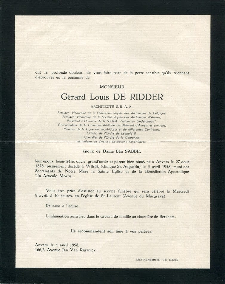 Geboorte en overlijden: Hij werd geboren in Antwerpen op 27 augustus 1878 en overleed daar op 3 april 1958. Hij ligt begraven op de begraafplaats Schoonselhof (perk 03-E-25).
