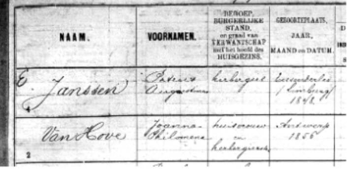 27 October 1878 (oktober volgens het trouwboekje, september volgens het bevolkingsregister) : Huwelijk van Gust Janssen en Philomena Van Hove