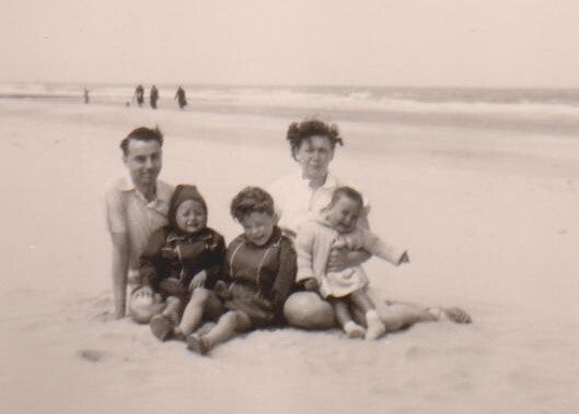 Familie Van Velthoven. vlnr : Adolf, Didi, Jan. Bertje, Albert, Irma Vandeleur met Luce op haar schoot.