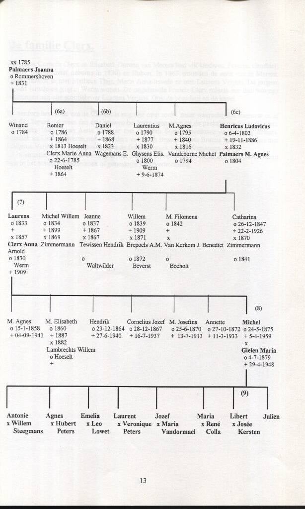 Generatie 6c. Henricus L. Verjans, geboren op 6 april 1802 als jongste zoon van Laurens en Joanna Palmaers, huwde in 1832 met Palmaers M. Agnes. M. Agnes is ‘n dochter van Michel Palmaers en Catharina Raymaekers, eveneens een landbouwersgezin. Henricus L. was landbouwer te Merem. Er sproten uit dit huwelijk Laurens, Michel, Jeanne, Willem, Filomena en Catharina. Aan onze stamvader, Laurens, wordt een apart hoofdstuk gewijd.