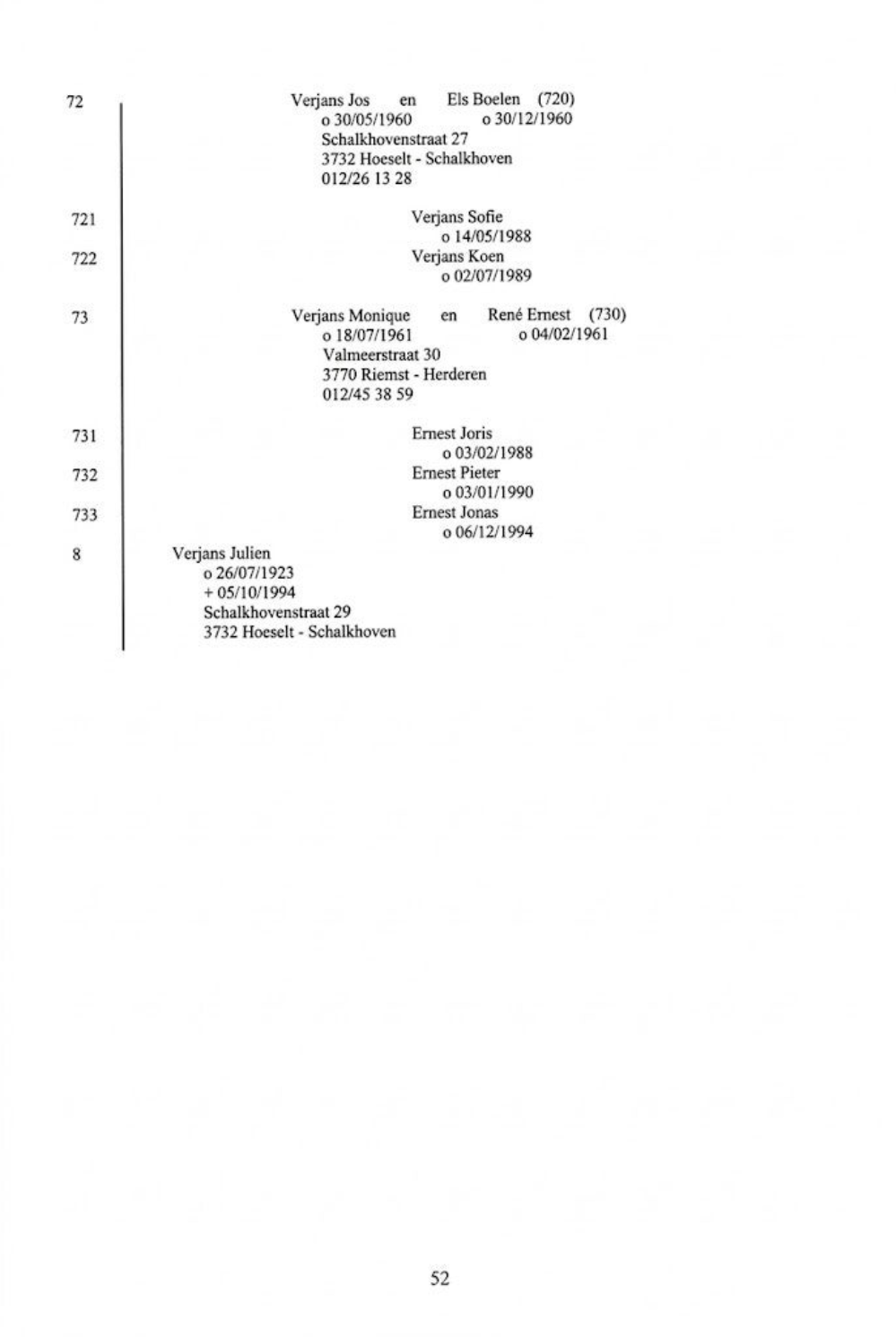 Generatie 2a.b. Een andere zoon van Lambertus en Gertrudis, Aegidius Verjans, geboren te Schalkhoven op 4 februari 1653, kwam terug naar Hoeselt om er Agnes Stulens te trouwen en om zich aldaar te vestigen als smid. Agnes schonk hem 6 kinderen. Twee van zijn zonen werden volwassen: Lambertus en Johannes.