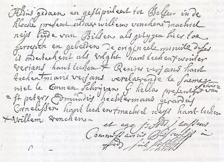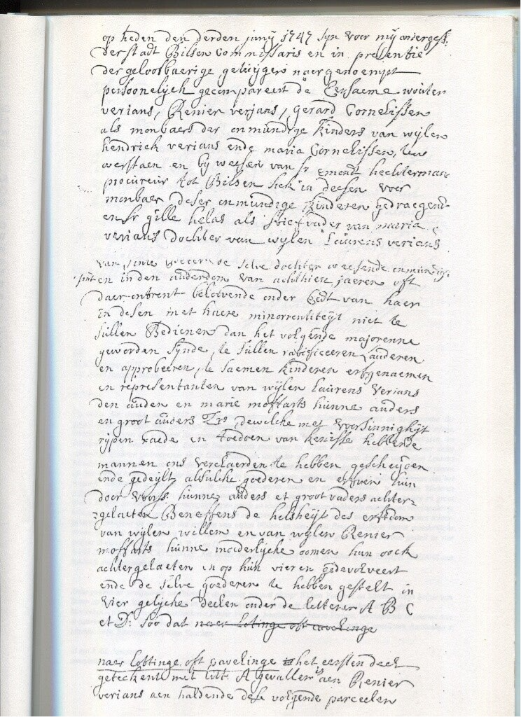 Verder voeg ik hierbij de inleiding en het slot van een delingsakte uit 1747. Het zijn de goederen van wijlen Laurentius Verjans en Maria Moffarts en de onverdeelde goederen van haar ongehuwde broers, Willem en Renier. Er worden vier loten verdeeld onder hun kinderen. In totaal gaat het over +/- 200 roeden, geen klein koekje voor die tijd. Ten tijde van deze deling waren er heel wat gronden belast met een of ander stelsel van cijnzen of belastingen. b.v. met een vat tarwe Tongerse maat (=29 liter), of met 5 broden voor de armen, of met een jaarlijkse leesmis, met een Curinger leen. Merken we ook op dat de ondertekenaars van de akte hun naam niet konden schrijven, ze ondertekenden door een kruisje te tekenen. En de familienaam is Verians.