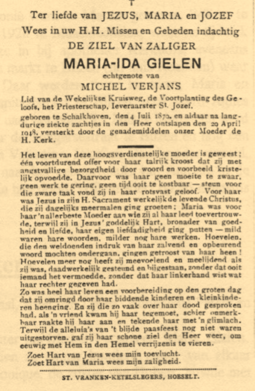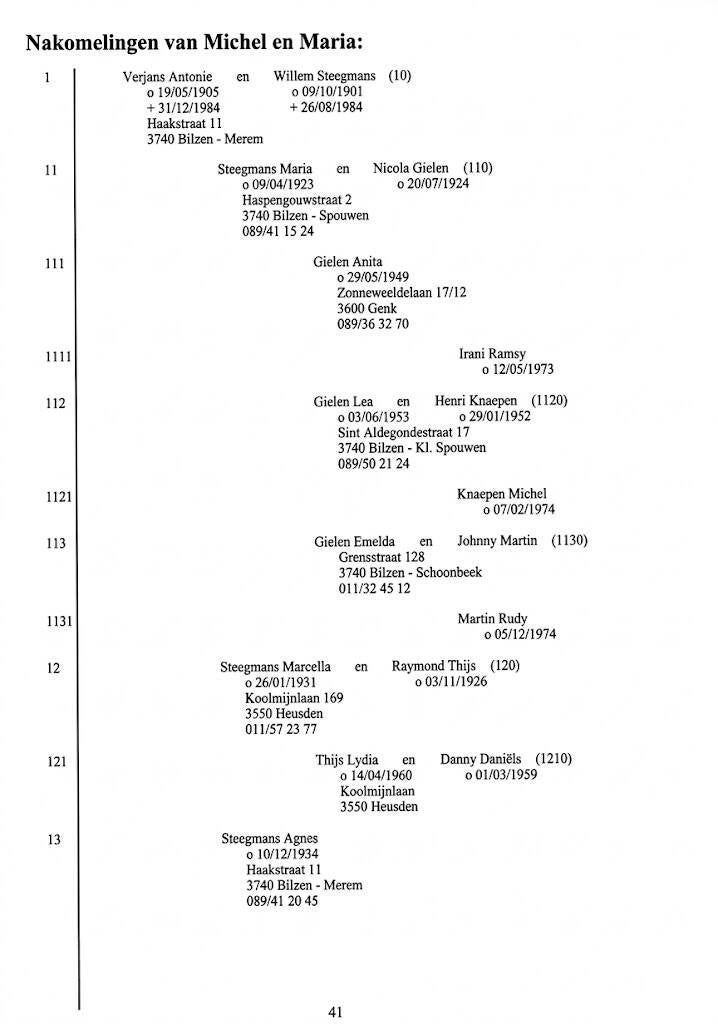 Het opstellen van een stamboom is een arbeidsintensieve bezigheid en zonder de hulp van anderen kon dit werk niet tot stand komen. In naam van al de nazaten van Michel Verjans en Maria Gielen dank ik de mensen van de VZW Hoeseltse Geschiedkundige Studiegroep, met name Lea Boes, Christiane Jacobs en Piet Thoelen, Frans Maurissen van Bilzen, Maurice Verjans van Romershoven, Victor Knapen van Vliermaalroot en wijlen Eerw. Robert Rubens. Tevens dank ik al de familieleden en anderen die mij aan informatie hielpen.