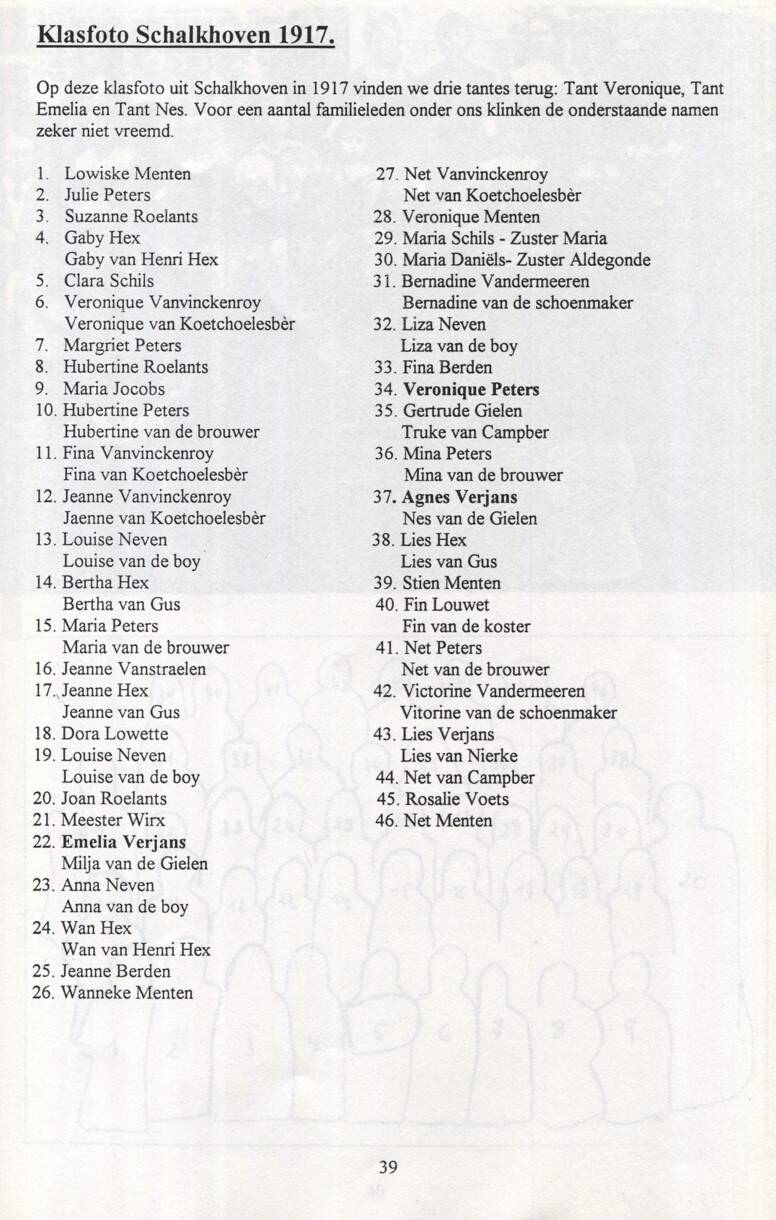 Laurent en Veronique werden beiden geboren in Schalkhoven, Veronique in 1907, Laurent in 1908. Op nauwelijks honderd meter van mekaar wonend, groeiden ze samen op, gingen naar dezelfde school en kerk en vonden mekaar regelmatig terug in hun vrije tijd. Na hun lager onderwijs ging Veronique drie jaar naar “de Soeurs de Marie” in Glons. “Om haar frans te leren” zoals dat toen heette. Ondanks haar goede resultaten diende ze daarna thuis te blijven om te helpen op de boerderij en in het grote gezin. Laurent werd “voerman” op de boerderij bij zij broers Libert en Jules. Hij werkte met de paarden en stond grotendeels in voor hun verzorging. Ron van de Gielen en Veronique van Peters leerden mekaar kennen langs Stefanus Lowet en Fernand Peters die boezemvrienden waren van Laurent. Ze trouwden op 20 oktober 1936 voor de wet en ‘s anderendaags voor de kerk. Als huwelijksreis was een abonnement voorzien om per trein een week rond te reizen in België. Een zekere “Maria” die tijdens de eerste oorlog als vluchtelinge bij Gielen verbleven had, had hen daartoe aangezet en ook enkele dagen logies aangeboden in Antwerpen. Het begon al slecht want bij de verplaatsing naar Hoeselt had de chauffeur, Meester Willems, een ongeval, zodat ze nog maar net hun trein haalden. De trip beviel de kersverse echtgenoot niet goed, hij had heimwee naar de boerderij en de beesten. Na drie dagen was er geen houden meer aan en keerden ze vroegtijdig terug. Er stond een koe op kalven en daar wilde Laurent zonder fout nog bij zijn. Het huwelijks- en gezinsleven verliep- zoals dat wel meer gebeurde in die tijd- op speciale manier. Veronique bleef wonen en werken bij haar thuis. Laurent kwam er ‘s nachts slapen, maar ging tijdens de dag terug naar het ouderlijk huis om er samen met zijn twee broers te werken. Toen Ma ( Maria) stierf stond vooral Libert in voor het huishouden, al was er soms wat hulp van “ Maria van Coxkes” Dit bleef zo tot 1 april 1955, toen Josée Kersten, de vrouw van Libert, in Schalkhoven kwam wonen en Laurent na de deling bij de familie Peters-Vanvinkenroye samen met Veronique de boerderij overnam. Ze waren toen bijna 19 jaar getrouwd en hadden hun vijf kinderen, waarvan de oudste, Jos, reeds 17 jaar was en vanaf juli thuis bleef om op de boerderij te helpen. Laurent kan het best getypeerd worden als een “boer in hart en nieren”. Hij was samen met zijn broers gespecialiseerd in het kweken van kwalitatieve rasrunderen. De jaarlijkse vee- prijskampen in Borgloon, Tongeren en later in Alt-Hoeselt waren een ware gebeurtenis. Er werd een hele rits aan eremedailles en eerste prijzen behaald. De veeprijskampen kregen gewoonlijk een staartje, Zoals die keer dat het hele gevolg, de kampioenstier incluis, zijn intrede deed in het café “Bij de Koster”. Een hele tijd was ook de bondstier kind des huizes bij de gebroeders Verjans. Coppi was een van de bekendste zware heren en een beroemd stamvader.