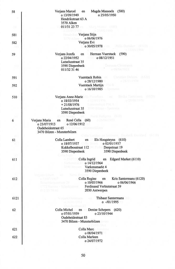 Generatie 6a. Renier Verjans, zoon van Laurens en Joanna Palmaers, is een van de stamvaders van Renier Verjans. Deze is momenteel Deken van Borgloon.