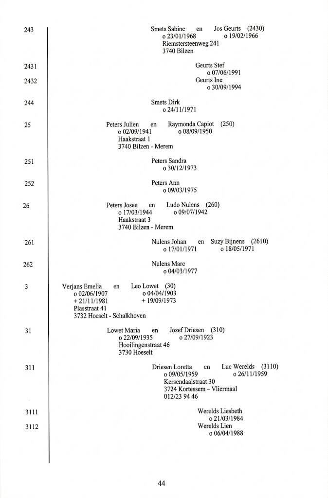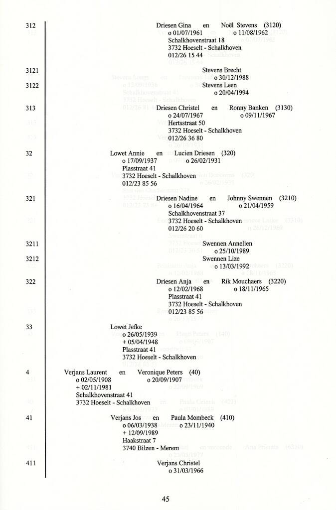 Wat de Verjansen betreft heb ik een afstammingslijn kunnen opstellen van 12 generaties tot 1595. Voor Gielen tot 1752. Van de laatste generaties krijgt u enkel een overzicht.