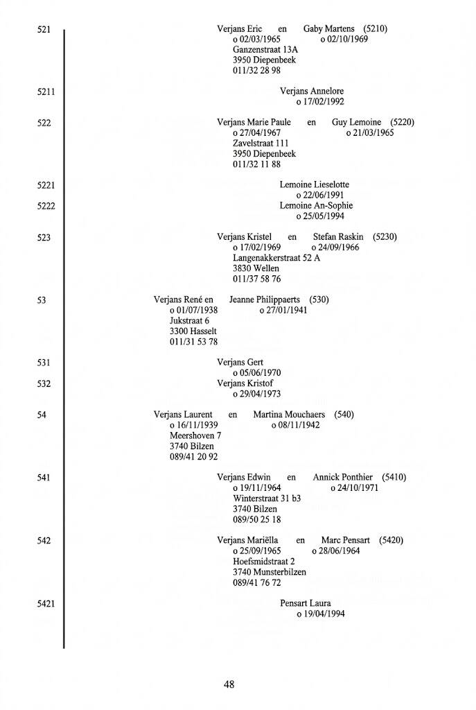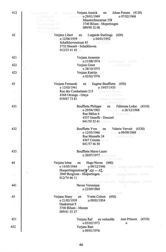 Generatie 2a.a. Ook zijn zoon Arnold Verjans huwde er , zelfs twee keer, en kreeg er 10 kinderen. Arnold kwam in 1706 om het leven ‘prope Leodium in via carbonaria’, ergens bij Luik, in de koolmijn. Slechts één van zijn zonen, Johannes, zette deze tak van de stamboom verder. Voor zover op te maken uit de eerder beperkte gegevens die uit de omliggende ‘dochterparochies’ van Hoeselt de tijd trotseerden, zou er op de drempel van de Franse Revolutie maar één mannelijke afstammeling van Johannes en Arnold meer overblijven: Edmundus Verjans, die in 1795 geboren werd, onwettige zoon van Ida Verjans, een achterdochter van Arnold.