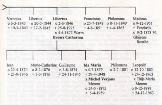 De oudste, Agnes, (1) huwt met Joannes Simons, eveneens landbouwer te Schalkhoven. Agnes overlijdt op 48 jarige leeftijd. Hun kinderen waren Wilhelmus, mijnwerker en woonachtig te Flexhe-Slins, Jan, idem, Ida ( huwde met Henri Hex, herbergier te Schalkhoven), Libert en Catharina. De tweede, Ida, (2) huwde met Mombeek Godefridus van Sint-Hubrechts-Hern. De derde is Bartholomevis Willem (3). Dan komt Joannes (4) of Jan. Joannes was landbouwer en huwde in 1861 met Elisabeth Morhay. Ze verbleven van 1884 tot 1910 op de boerderij Ridderborn te Vliermaalroot. Uit dit huwelijk sproten Ida, Joannes Lambertus, Ambrosius en Philomène. Joannes Lambertus huwt met Ceulemans Aldegondis van Kortessem. Dit waren de ouders van o.a. Octavie Gielen van Kortessem. Ambrosius huwt met Maria Wijsmans. Hieruit volgt als jongste Henri Gielen van Vliermaalroot. Dan komen er in het gezin Gielen-Renaerts drie kindersterften voor: Anna Maria (5), Veronica (6) en Libertus (7). Op de achtste, Libert, komen we verder terug. Libert huwde met Catharina Broers. Het zijn de ouders van o.a. Ida Maria Gielen. Franciscus (9) werd amper 3 jaar en Philomèna (10) 16 jaar.