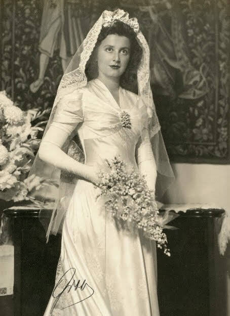 Juffrouw Maud De Ridder droeg een elegante japon van witte zijde met een lange sleep en een fijn tule sluier, vastgehouden door een oranjebloesem. Zij hield een boeket van witte camelia’s in de hand.